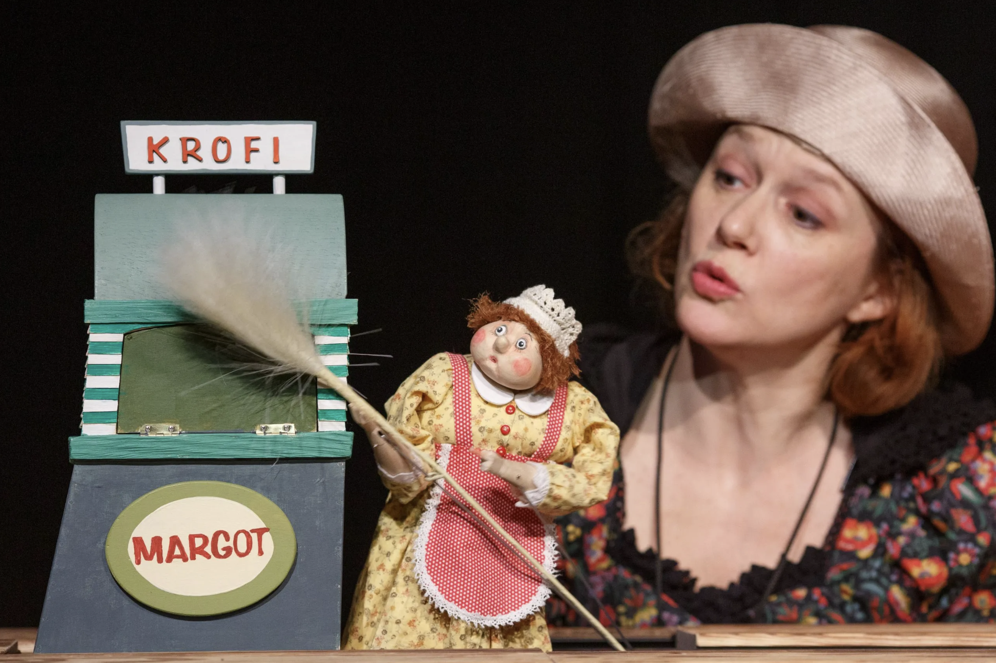 Odločitev, da idejna snovalka uprizoritve Svetinovo krovno zgodbo o debeli pekovki Margot in slikarju Frideriku Žemlji postavi v ospredje kot zgodbo v zgodbi, se izkaže za posrečeno, tudi dobro preizkušeno in preprosto delujočo izbiro. Katja Povše se je z leti slovenskemu občinstvu s svojim Pripovednim gledališčem Gdč. Bazilike že uspela pokazati kot izkušena lutkovna animatorka, ustvarjalka in pripovedovalka. Svoj lik gospodične Bazilike je tako v uprizoritvi še enkrat izpostavila, morda nepoučenemu gledalcu ali gledalki na začetku še enkrat pojasnila, da je predvsem popotnica, nabiralka dobrih zgodb in ljubiteljica avantur. Okvirno zgodbo, v katero se vplete Svetinova zgodba Margot in Friderika, tako predstavlja sestop na železniški postaji, kjer Gospodična Bazilika išče izgubljeno prtljago in svojo prijateljico kravo Lisko. Krave Liske ni nikjer, prtljago, ki naj bi jo čakala pod številko 013, pa zamenja velik lesen zaboj. Zaboj povede v lutkovno animirano zgodbo in igrano zgodbo o Margot in Frideriku, pri čemer Povše ohrani svojo začetno vlogo Bazilike, z lutkami se sporazumeva in kontrolirano izmenično prehaja iz animatorke lutk Margot, Friderika, vlaka (ta potuje od Maribora, McMurdoja na Antarktiki, Calere v Alabami, Appenzla v Švici in nazaj do Maribora) nazaj v potujočo pripovedovalko. Dovršeno oblikovana scenografija po zaslugi Žige Lebarja (leseni zaboj namreč predstavlja množico uprizoritvenih možnosti s svojim razstavljanjem, sestavljanjem, dograjevanjem in odstranjevanjem, v katerega se vpletejo prilagojene lutke in scenski elementi, da ustvarijo nov pripovedni prostor) in umetelno izdelani kostumi lutk izpod rok Iztoka Hrge se skladno povežejo s kostumom Bazilike (Eva Jakopič).